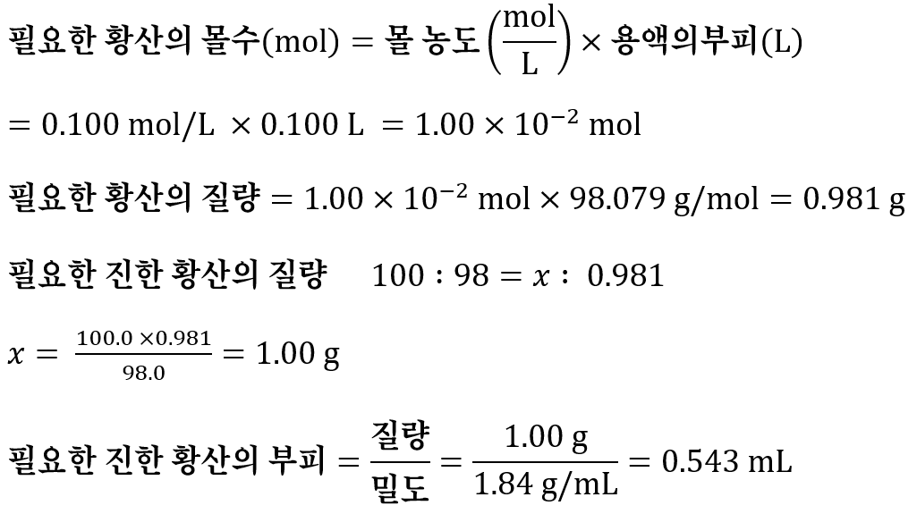 - 100 mL 비커를 전자저울에 얹고 증류수를 30 mL 쯤 넣고 영점을 맞춘 후, 진한 황산 1.00 g이 되도록 스포이트로 비커에 한 방울씩 떨어뜨린다.