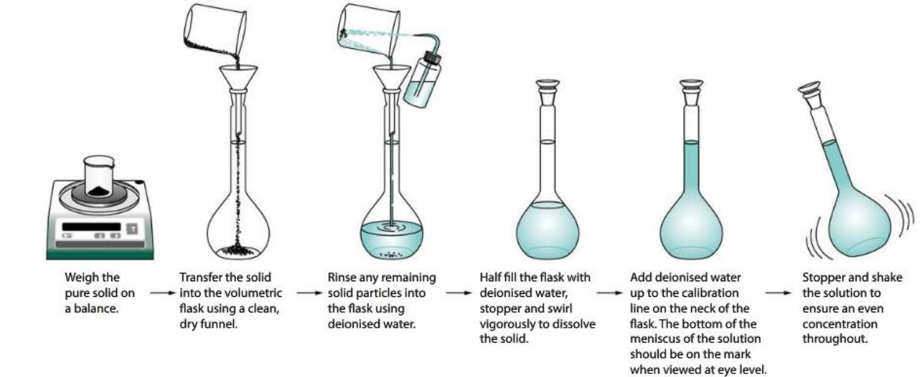 위와 같이 필요한 용질의 질량을 계산한 후 다음과 같은 두 가지 방법으로 용액의 제조한다.